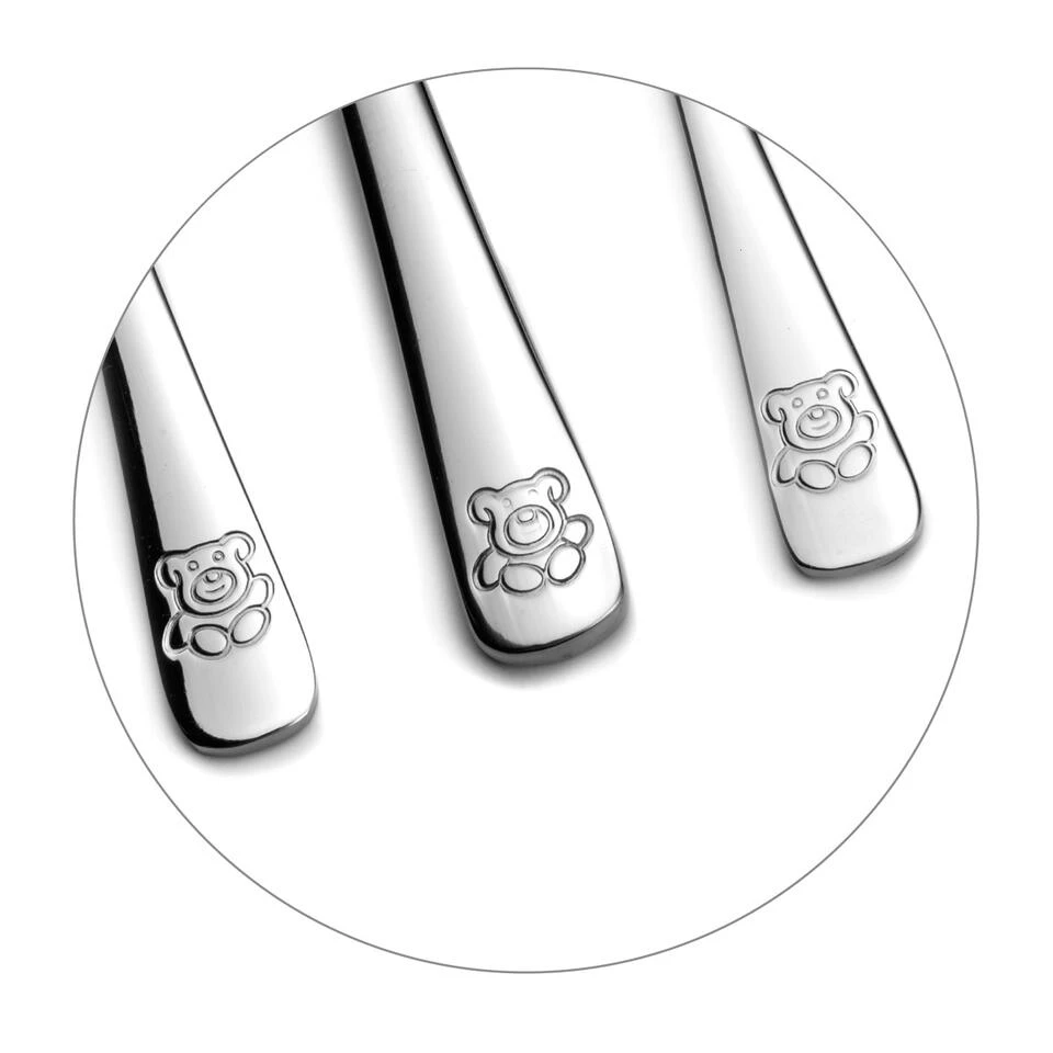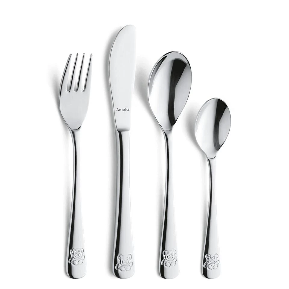 De 4-delige Amefa kinderbestekset Teddy is speciaal ontworpen voor jonge kinderen, die trots kunnen zijn op hun eigen bestek. De set bestaat uit een mes, een vork, een lepel en een toetjeslepel waarop vrolijke afbeeldingen van een lieve beer staan. De normaal scherpe delen van het mes en de vork zijn afgerond zodat ze veilig te gebruiken zijn voor de kleine tafelgenoot. De set wordt geleverd in een vrolijke en kleurige cadeauverpakking. Het bestek heeft een hoogglans afwerking.