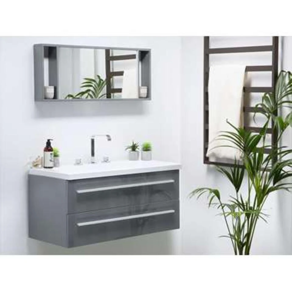 Exclusieve badkamermeubels in grijs. Met deze moderne badkamermeubelset begint jouw dag vroeg in de ochtend met een goed humeur! De structuur van de hangende kast is gemaakt van robuust MDF met melamine coating en de fronten van de twee laden hebben een coating van hoge kwaliteit PVC-folie in beige. De ruime laden bieden veel opbergruimte en zijn uitgerust met een soft-close-systeem. De bovenste lade bestaat uit twee grote compartimenten en een kleiner compartiment in het midden. De onderste lade heeft een scheidingslijn in het midden. De brede aluminium ladegrepen verbeteren de moderne uitstraling en het rechtlijnige ontwerp van deze set. De fraaie wastafel van wit acryl is bijzonder onderhoudsvriendelijk en eenvoudig te reinigen.