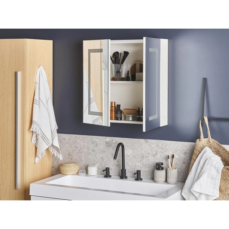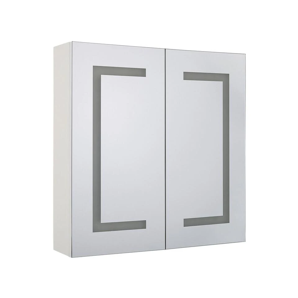 Spiegelkast met LED-verlichting voor de badkamer. Deze verlichte badkamerspiegel met geïntegreerde energiebesparende LED-balk kenmerkt zich door zijn moderne, elegante design. Er is voldoende ruimte achter de 2 spiegeldeuren om verschillende dingen zoals tandenborstels of parfums op te bergen. De scharnieren met softlock zorgen ervoor dat de deur zachtjes opent en sluit. De tuimelschakelaar aan de zijkant zorgt ervoor dat de LED-lamp eenvoudig aan en uit kan worden gezet.