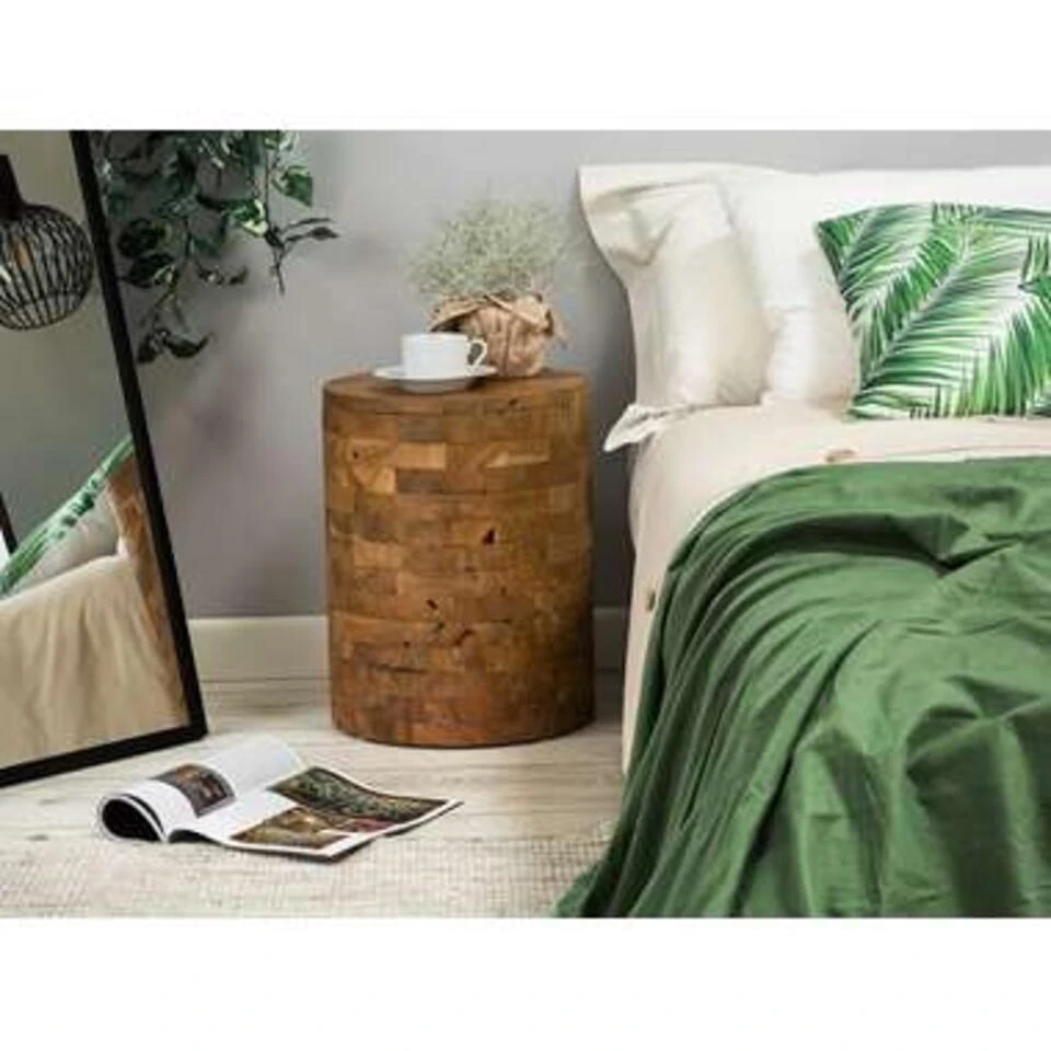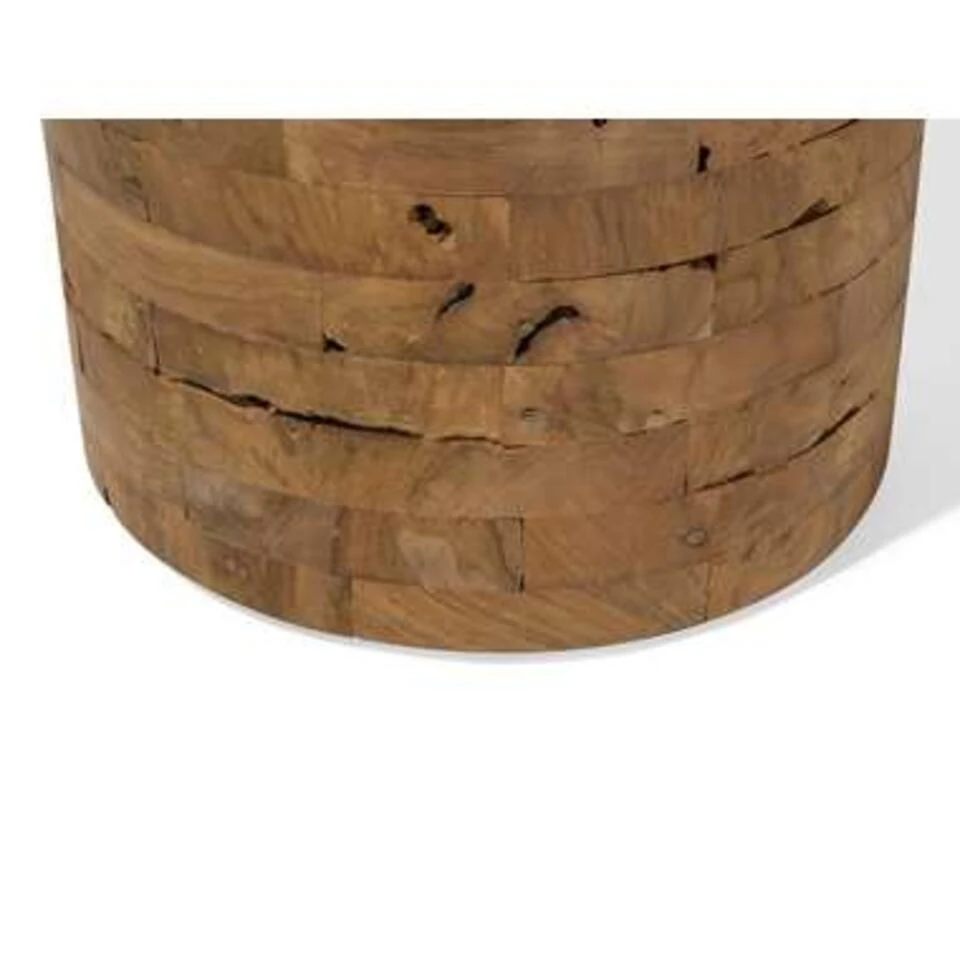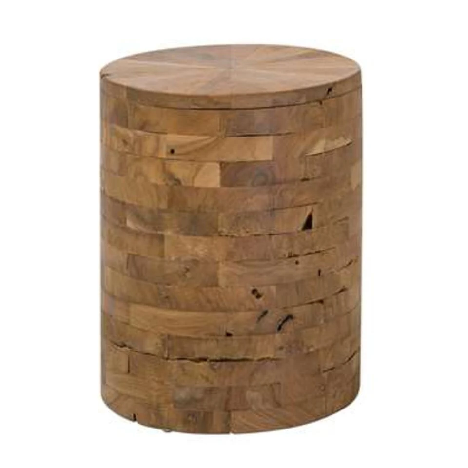 Multifunctionele bijzettafel van stevig teakhout. De karakteristieke cilindervorm van dit robuuste woonaccessoire bestaat uit rechthoekige stukken hout die als klinkers zijn gerangschikt. Het onbehandelde hout zorgt voor een natuurlijke en heldere sfeer, wat nog wordt onderstreept door de gerangschikte segmenten van het tafelblad. Een must voor elke natuurliefhebber