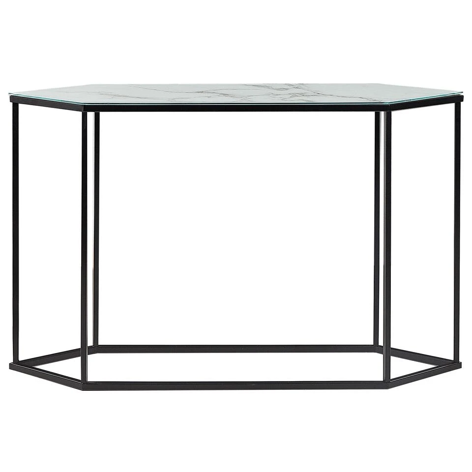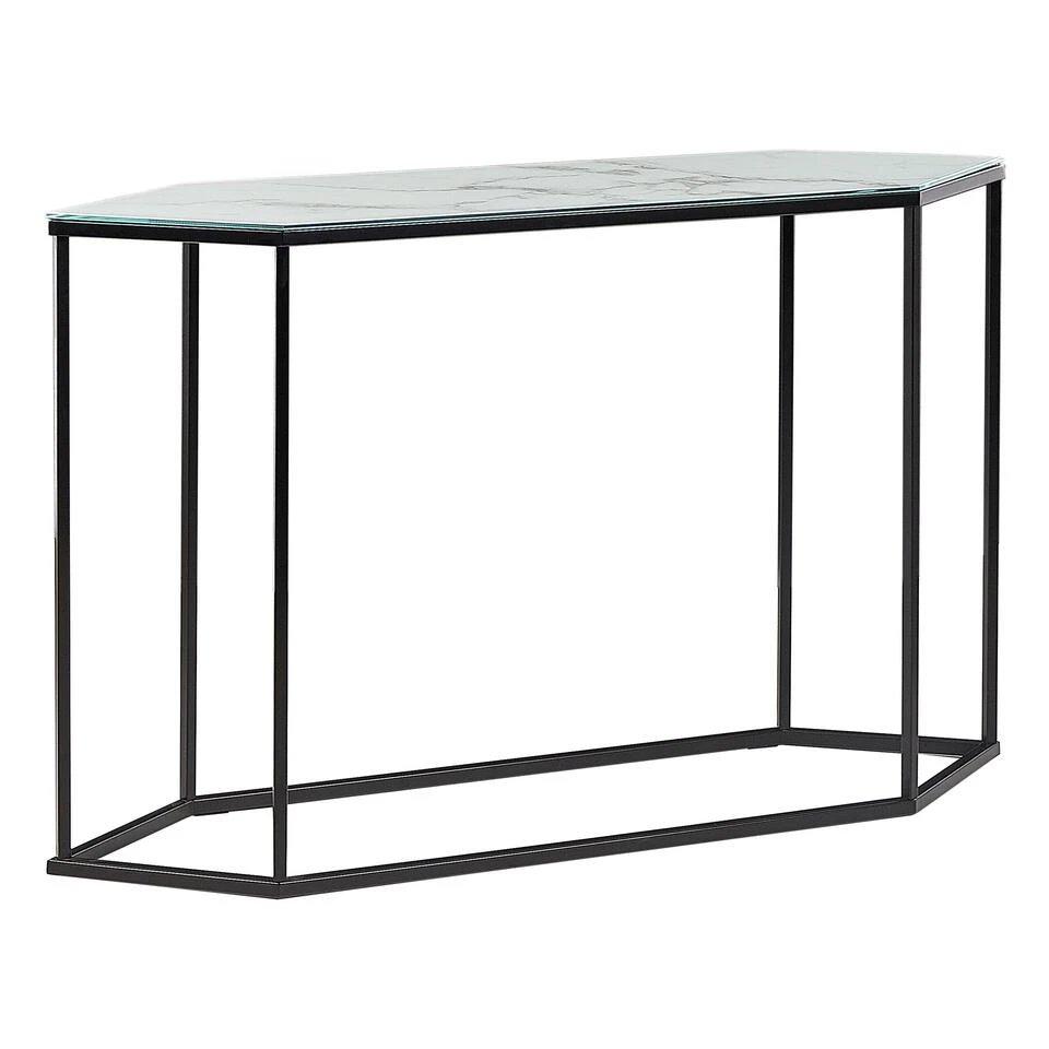Glamoureuze kaptafel met glazen blad met marmereffect en zwart metalen poten. Voeg een vleugje glamour toe aan je woonkamer, slaapkamer of hal met deze console met unieke geometrie. Het is voorzien van een blad van gehard glas, waardoor dit meubelstuk een marmereffect krijgt dat elegantie uitstraalt. De materialen zijn harmonieus gekozen om een perfect contrast met de oppervlakte te vormen.