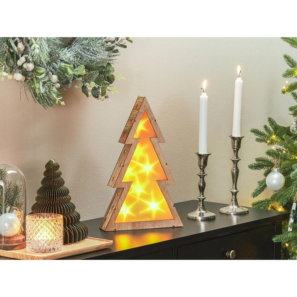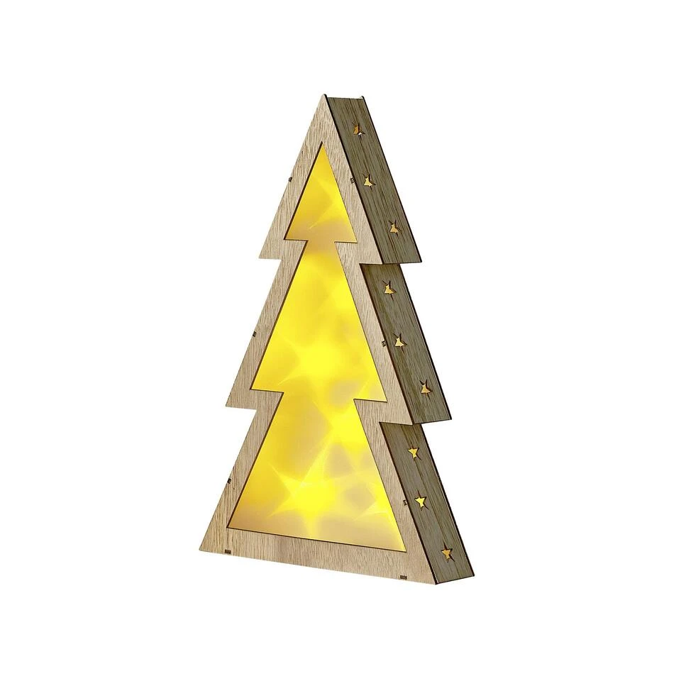 Houten kerstboom met LED-verlichting. Niet in elk huis past een echte kerstboom, maar als je de traditie niet wilt overslaan en je ruimte overzichtelijk wilt houden, kies dan voor een klein decoratief beeldje in de vorm van een kerstboom. Deze kerstboom, gemaakt van duurzaam populierenhout, is ook voorzien van LED-verlichting, dus je hoeft hem niet eens zelf te versieren. Omdat hij vrij klein is, kun je hem op een plank, consoletafel of andere meubelstukken plaatsen.