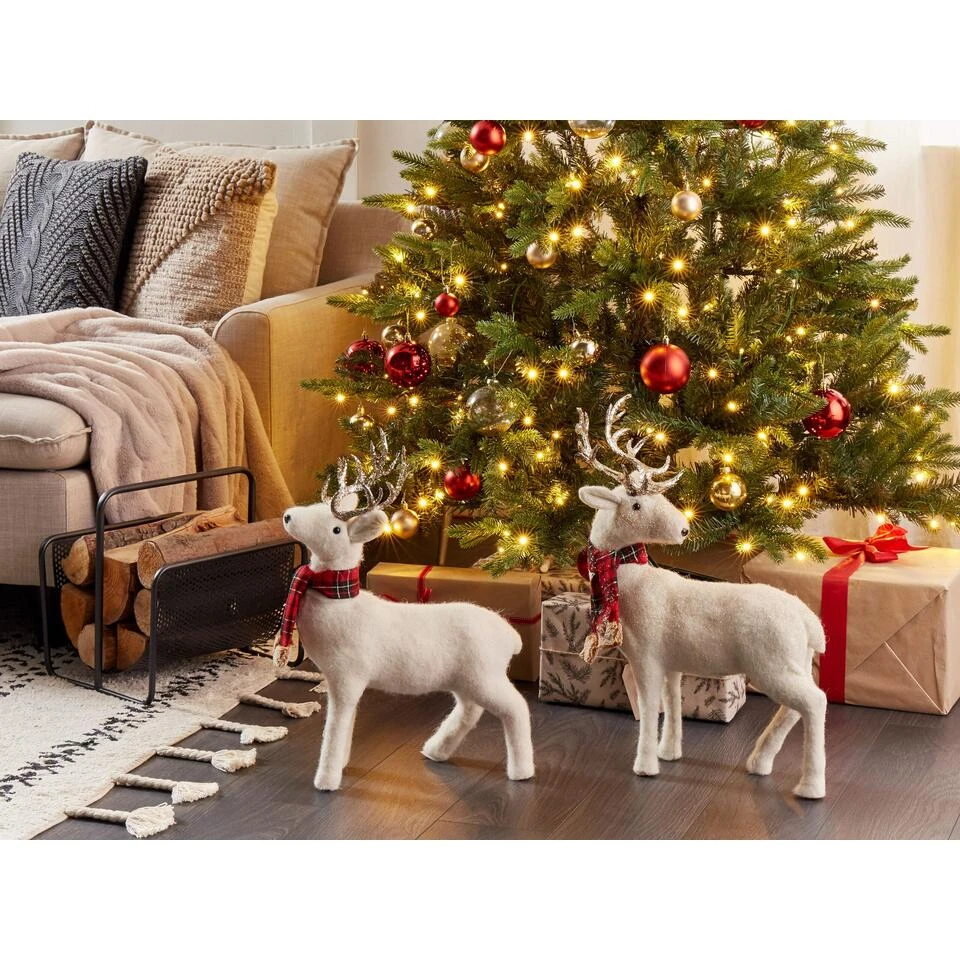 Decoratief Kerstbeeldje. Richt je huis in voor kerst en breng versieringen aan die een echte kerstsfeer creëren. Dit beeldje in de vorm van een rendier kan zowel op een dressoir als op de vloer geplaatst worden, vooral naast een kerstboom. Het beeld is bedekt met wit nepbont voor een realistisch effect. De tinten groen en rood op de geruite sjaal rond de nek van het dier verwijzen naar het kleurenschema van de kerstperiode en het glinsterende gewei zal perfect passen bij andere glanzende decoratie.