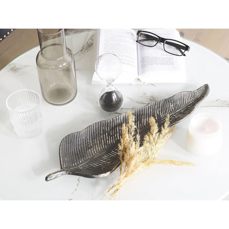 Decoratieve metalen schaal. Deze decoratieve schaal verfraait elke ruimte met een elegant vintage accent. De schaal is gemaakt van lichtgewicht aluminium, waarmee het perfect is voor het weergeven van jouw favoriete decoraccessoires. Daarnaast is het ook perfect voor het opbergen van sleutels en andere kleine voorwerpen. De zilverkleurige, verweerde afwerking samen met de bladvorm zorgt ervoor dat het naadloos opgaat in glamour, moderne en retro ingerichte kamers
