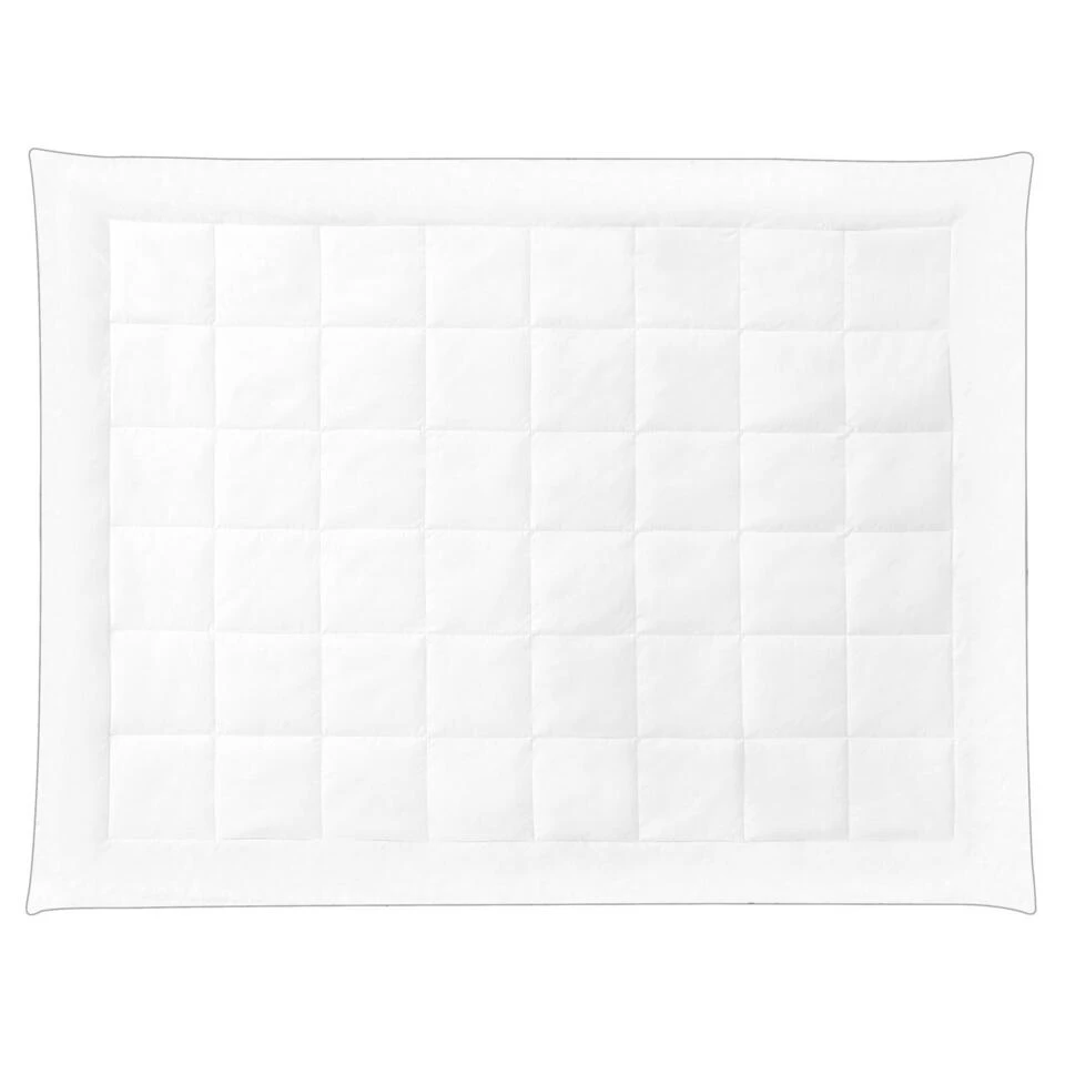 Wit dekbed van huid-vriendelijk Japara katoen met grijze rand. Dit dekbed is bijzonder temperatuur regulerend en heeft uitstekende hygiënische en isolerende eigenschappen. Dankzij de extreem lichte vulling ligt het model bijzonder zacht op de huid. Daarnaast heeft de deken een slijtvaste, onderhoudsvriendelijke hoes van zijdezacht Japara-katoen. Het grote geruite quiltwerk zorgt voor volume en beperkt verschuiven van de dekbedvulling en zorgt zo voor een gelijkmatige warmteverdeling. Het lichtgewicht dekbed is omzoomd met smalle, grijze satijnen bies die het textiel visueel upgrade.