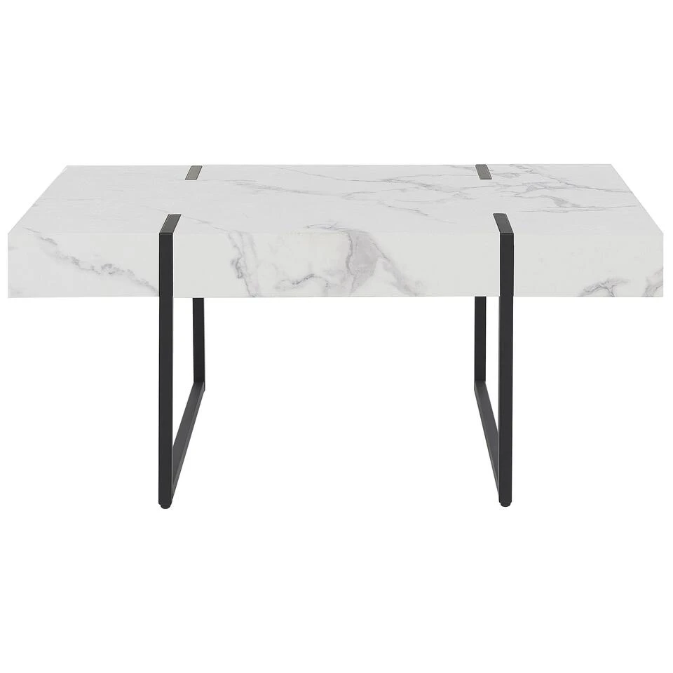 Rechthoekige salontafel met marmerfineerafwerking. Deze elegante salontafel past prachtig in elke moderne en traditionele ruimte en geeft je interieur een uniek karakter. Dankzij de materialen wordt het een stabiel meubelstuk dat vele jaren meegaat. De tafel heeft slanke donkere poten en het blad heeft een marmereffect voor een chique en tijdloze uitstraling.