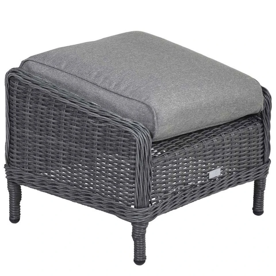 De voetenbank is: B 50 x D 58 x H 45 cm met wicker in de kleur earl grey met aluminium binnen frame en polyester kussen in de kleur reflex grey.