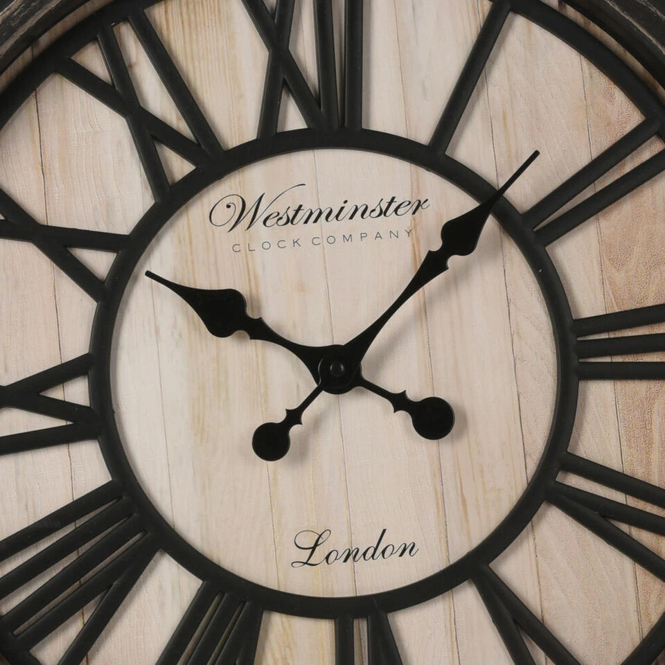 Wandklok voor aan de muur/wand in de huiskamer met Diameter 50 cm en dikte 5,5 cm. Kleur: zwart/hout/transparant glas. Met romeinse cijfers. Aan de achterkant zit een ophanging(bevestigingsmateriaal niet inbegrepen). Materiaal: kunststof/glas. Voeding: 1x AA-batterij, niet inbegrepen.