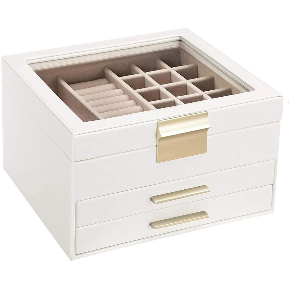 Juwelendoos – Met Glazen Deksel – 3 Niveaus – 2 Lades – Wit