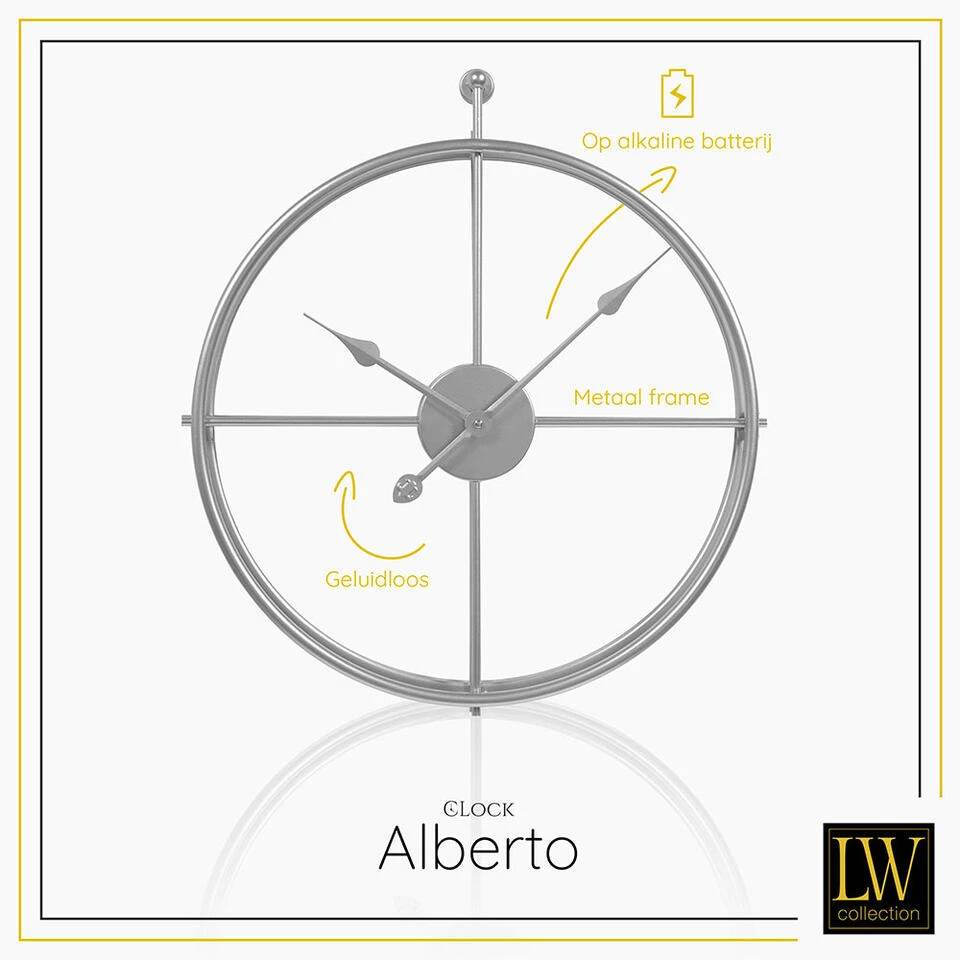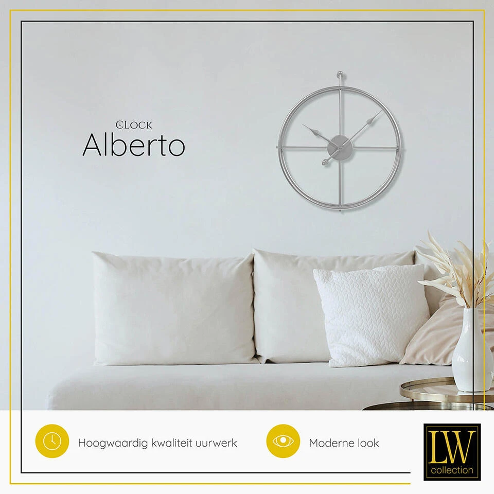 Wandklok ALBERTO is geen standaard klok die u in vele huishoudens zult treffen. Onze klanten die deze mooie klok in huis haalden zochten expliciet naar een exclusieve eyecatchende zilveren klok aan de muur.