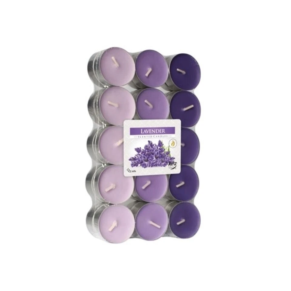 30x stuks Waxinelichtjes/theelichten. De waxinelichtjes zijn geparfumeerde kaarsen die naar lavendel ruiken en zijn verpakt per 30 stuks. Afmetingen: Diameter 4 centimeter. Hoogte 1,5 cm. Branduren: ongeveer 4 uur per stuk.