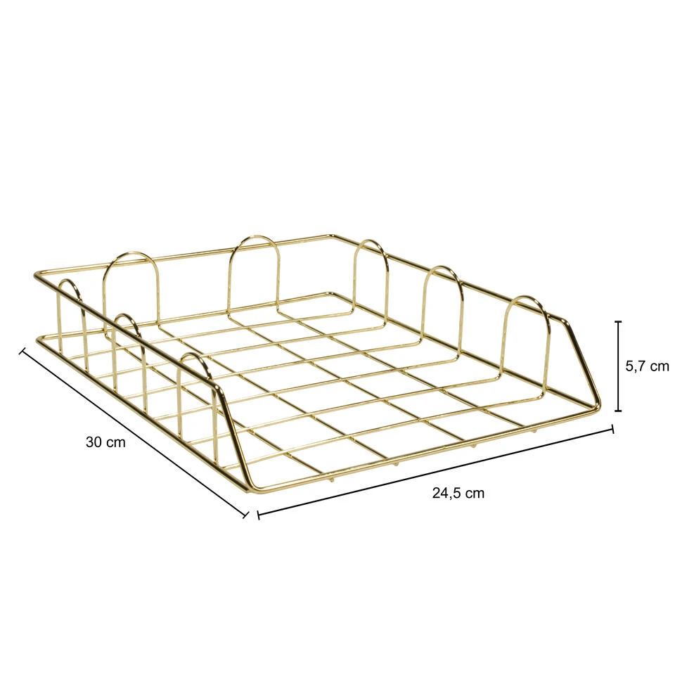 Deze QUVIO Brievenbak is een goudkleurige brievenbak die ideaal is voor thuis op je bureau,maar ook voor bijvoorbeeld op kantoor. Ondanks dat er veel via laptops en via de mail gaat tegenwoordig,zijn er toch nog talloze zaken waarvoor papier uitgeprint moeten worden of waarbij er papier ingescand moet worden. In situaties als deze is het erg handig dat formulieren netjes geordend liggen op een bepaalde plek en niet los en rommelig op tafel. In dit soort gevallen is een postbak dan ook erg handig op de werkplek. De afmetingen van de brievenbak zijn 30 x 24,5 x 5,7 cm (lxbxh).