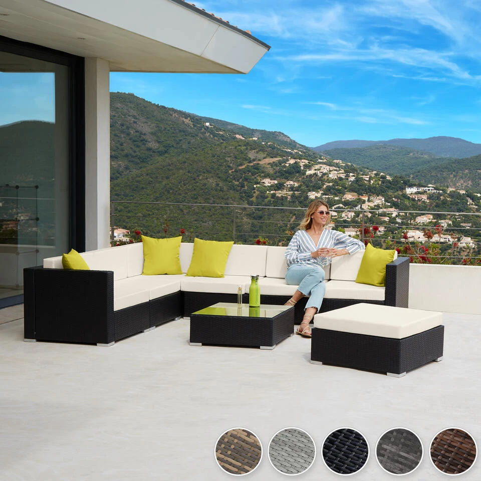 Voor in de tuin of binnen. Onze tuinset gemaakte van wicker kan veelzijdig gebruikt worden en geeft uw tuin, terras, wintertuin of woonkamer net dat ietsje meer. De comfortabele stoelen en de elegante tafel garanderen aangename uurtjes. De wicker set overtuigt niet alleen met zijn elegante look, maar ook met zijn lange levensduur. Door het lage gewicht kunnen de meubelen gemakkelijk verplaatst worden. Het glazen tafelblad ziet er heel stijlvol uit en is heel gemakkelijk te reinigen. De comfortabele polyester zitkussens zijn qua kleur perfect afgestemd op de tuinset en beschikken aan de achterzijde over een rits, zodat de kussenhoezen gemakkelijk gereinigd kunnen worden. Om de kussens te beschermen tegen doordringend vocht is het oppervlak geïmpregneerd. Zo rollen vuil- en waterdruppels er gewoon af. Door de verschillende elementen kan de set volledig naar wens opgesteld worden.