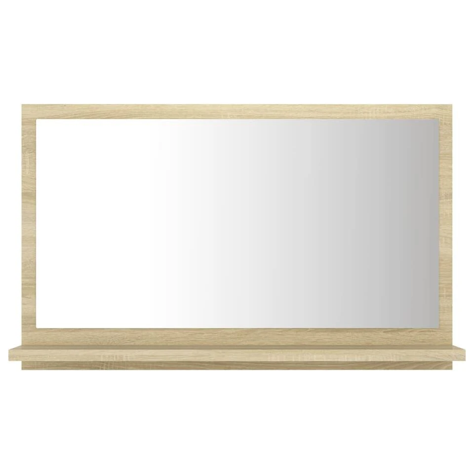 De wandspiegel is gemaakt van spaanplaat en acryl, waardoor hij duurzaam en stabiel is. Hij heeft 1 klein schap dat voldoende ruimte biedt om toiletartikelen, zoals zeep, shampoo en tandpasta, op te bergen. Bovendien is de spiegel gemakkelijk schoon te maken met een vochtige doek.