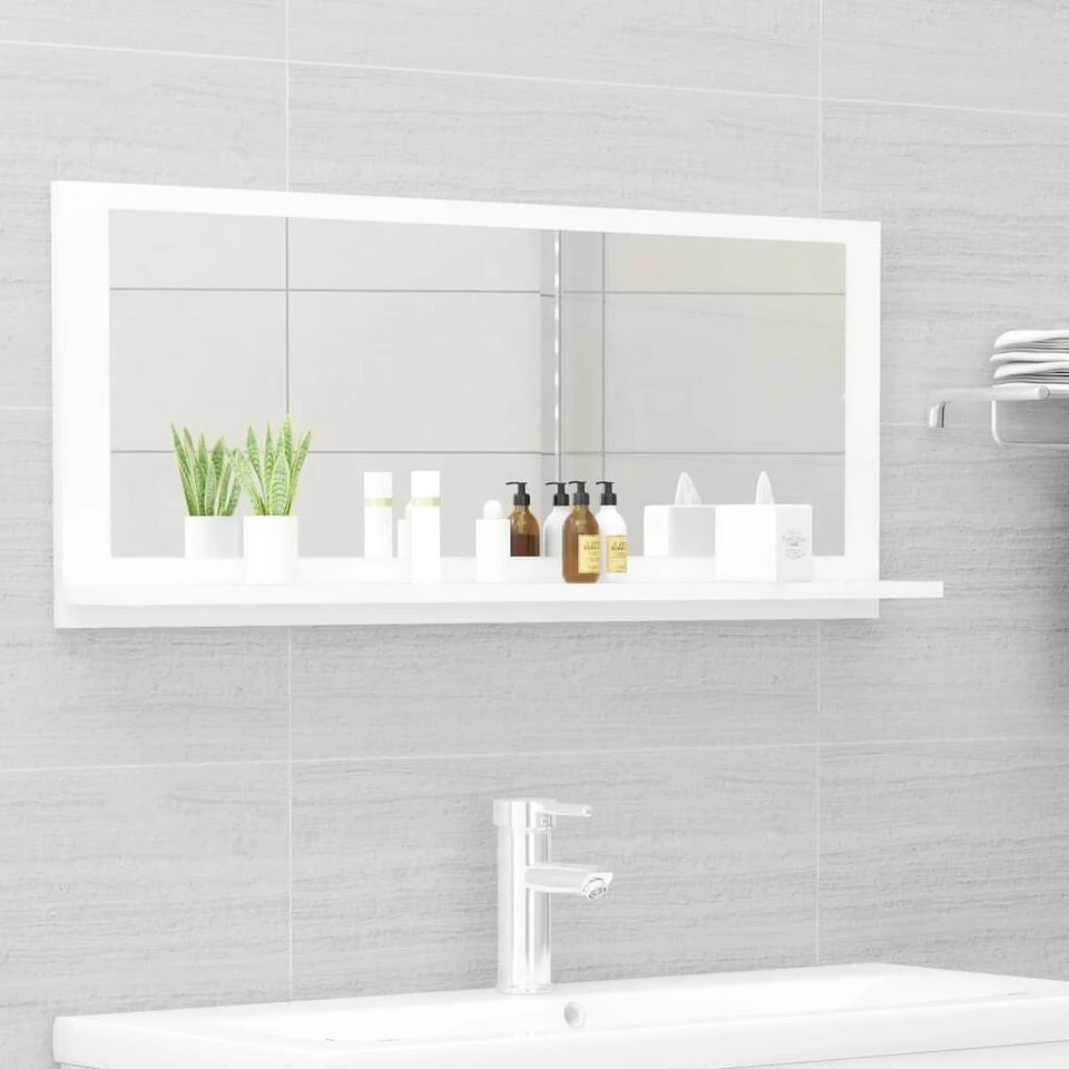 De wandspiegel is gemaakt van spaanplaat en acryl, waardoor hij duurzaam en stabiel is. Hij heeft 1 klein schap dat voldoende ruimte biedt om toiletartikelen, zoals zeep, shampoo en tandpasta, op te bergen. Bovendien is de spiegel gemakkelijk schoon te maken met een vochtige doek.